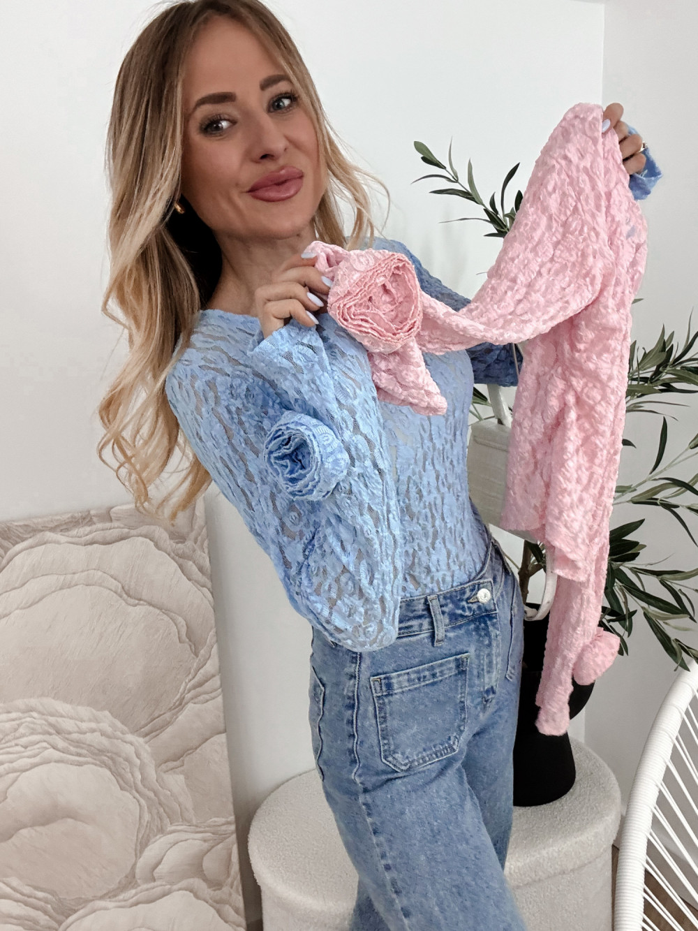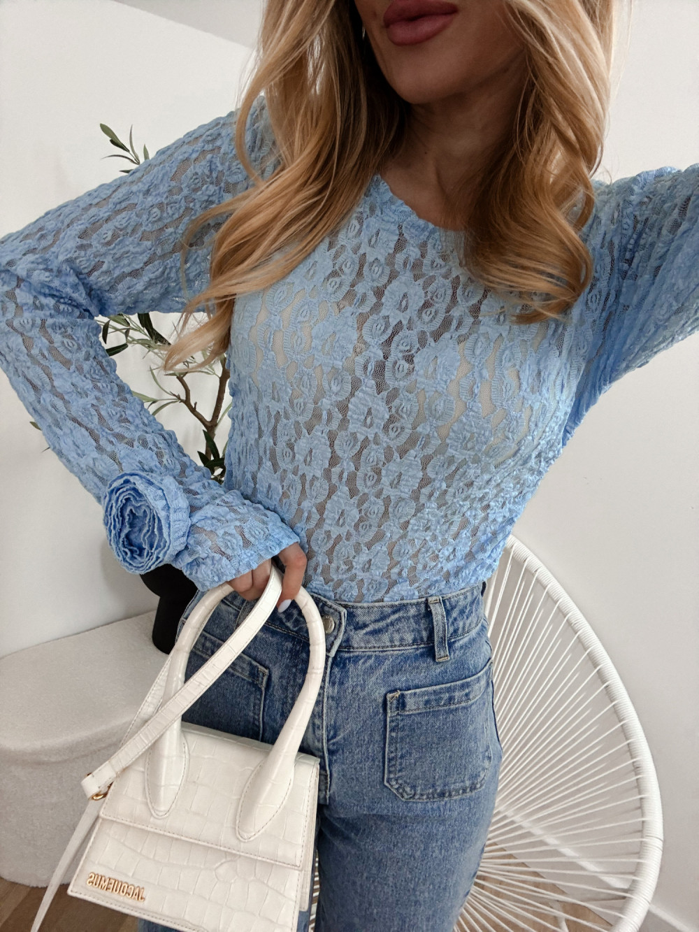 ROSA - BLUZKA KORONKOWA Z RÓŻĄ NA RĘKAWIE BŁĘKIT