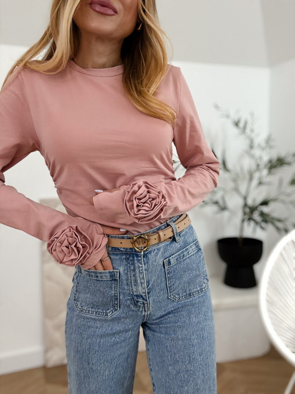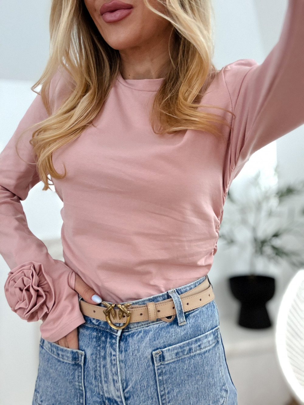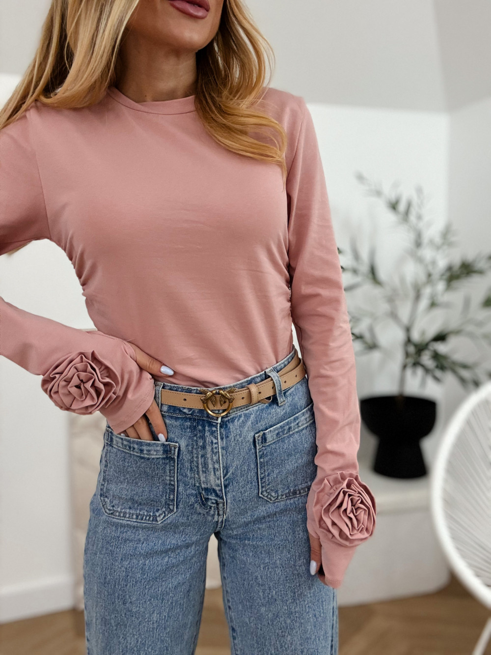 MINDA - BLUZKA BASIC Z KWIATAMI NA RĘKAWACH PUDROWA