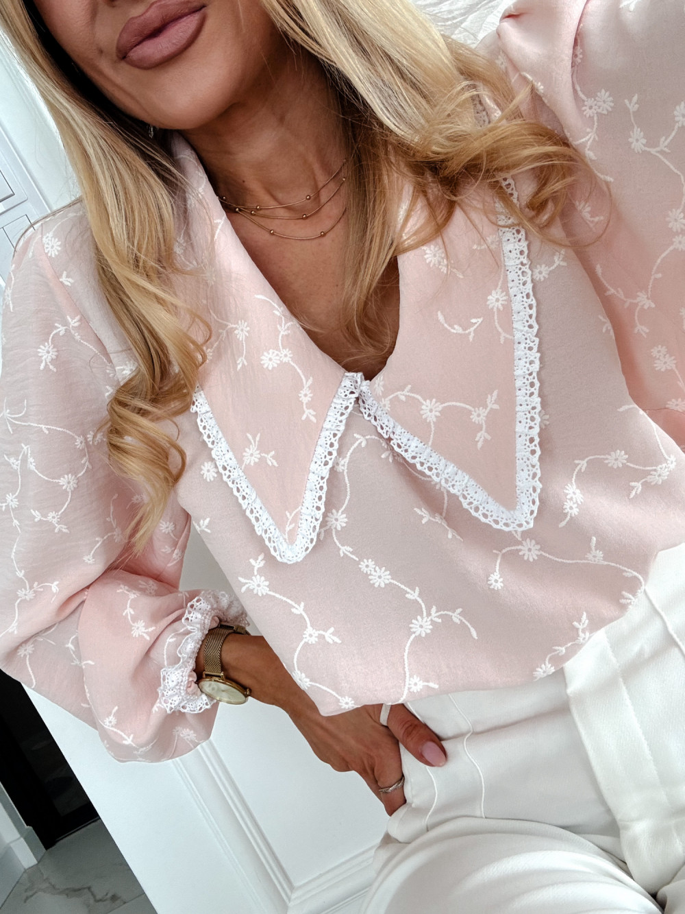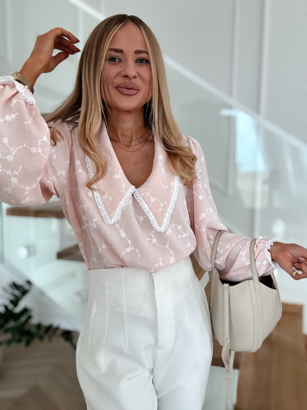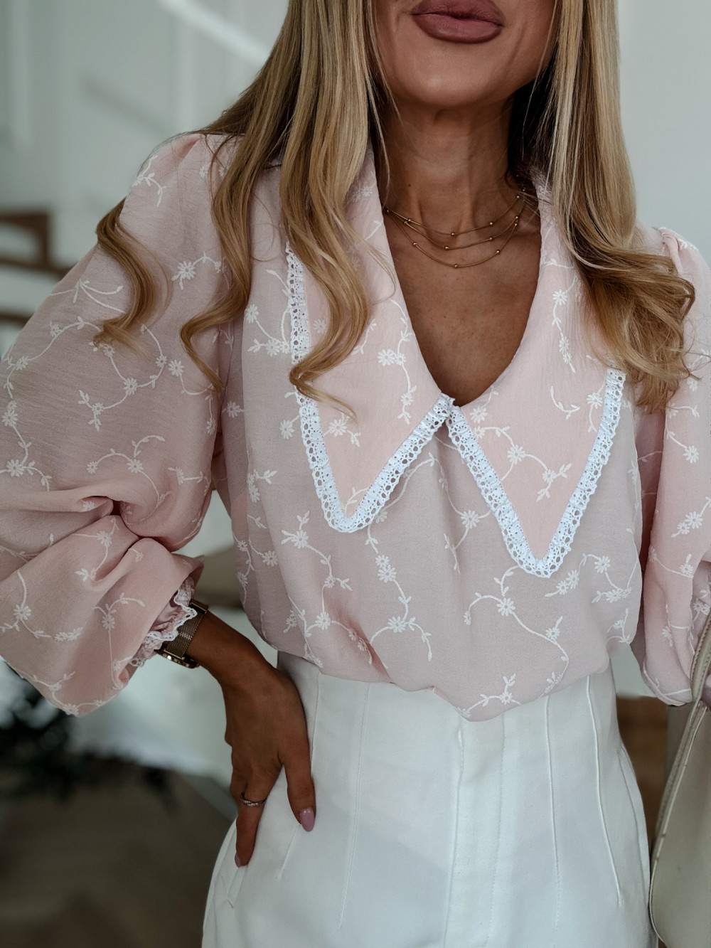 MARCELA- KOSZULA Z KOŁNIERZYKIEM PUDROWA Z BIAŁYM HAFTEM