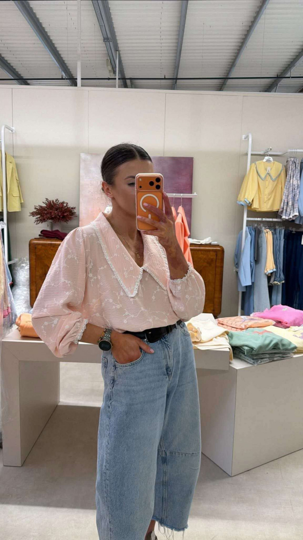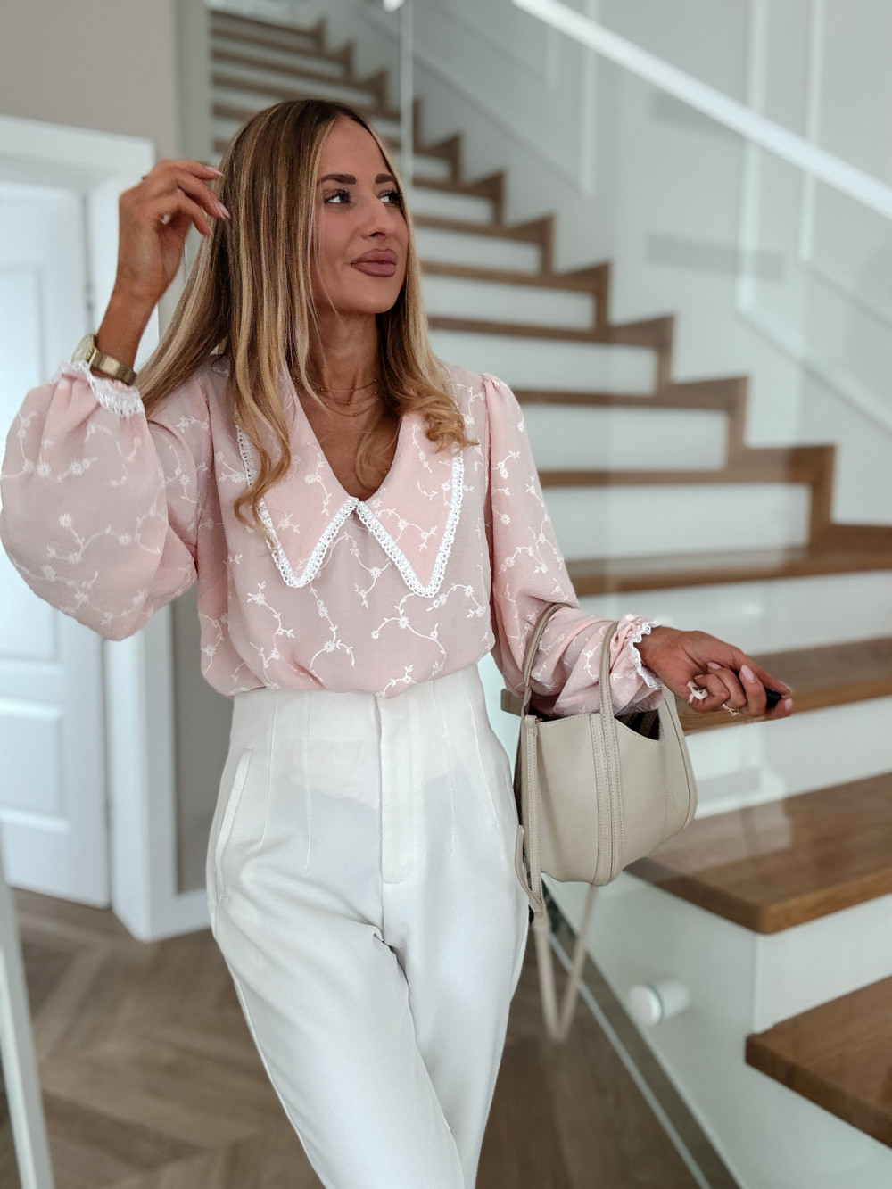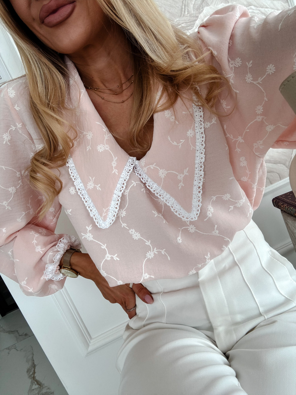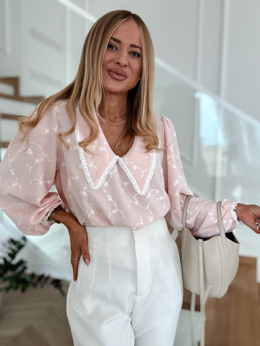 MARCELA- KOSZULA Z KOŁNIERZYKIEM PUDROWA Z BIAŁYM HAFTEM